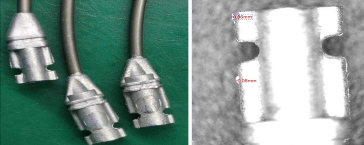 The zinc alloy joint pipe, after being trimmed by the cryogenic deflashing machine, had visible large burrs removed, and upon magnification at 30 times under an electron microscope, the remaining small burrs were as low as 0.06mm, within the range required by the customer. The test results were good, and the product has now been sent to the customer for further performance testing.