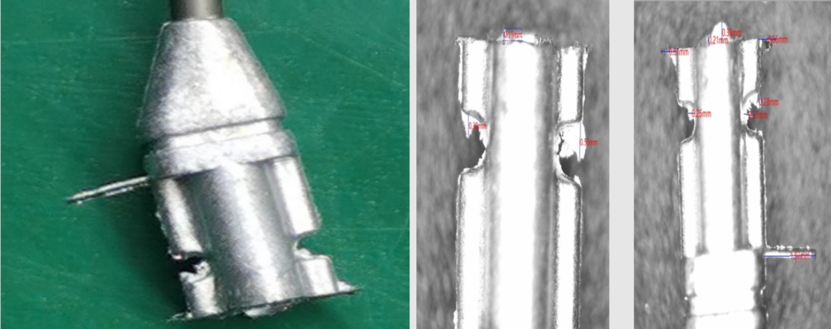 Upon receiving the zinc alloy joint pipe, we promptly assessed the burrs on the joint and found that the pipe was welded to the joint and could not be separated. Therefore, both had to be placed into the cold trimming machine for edge trimming. The thickness of the burrs ranged from 0.21 to 1.97mm as observed under an electron microscope, and the burrs were also clearly visible to the naked eye.