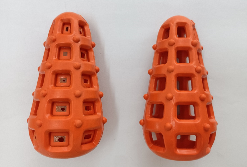 STMC conducted edge deflashing tests on this type of product, using the NS-180 model for mass production. The product is uniformly orange in color, resembling a carrot in shape. After demolding, there are burrs remaining at each hole, and manual burr removal requires a large amount of labor.