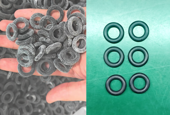 The surface of the O-ring after deflashing is smooth without any burr residue. The left image shows condensation on the product surface when it just came out of the machine, which does not affect the material of the product.