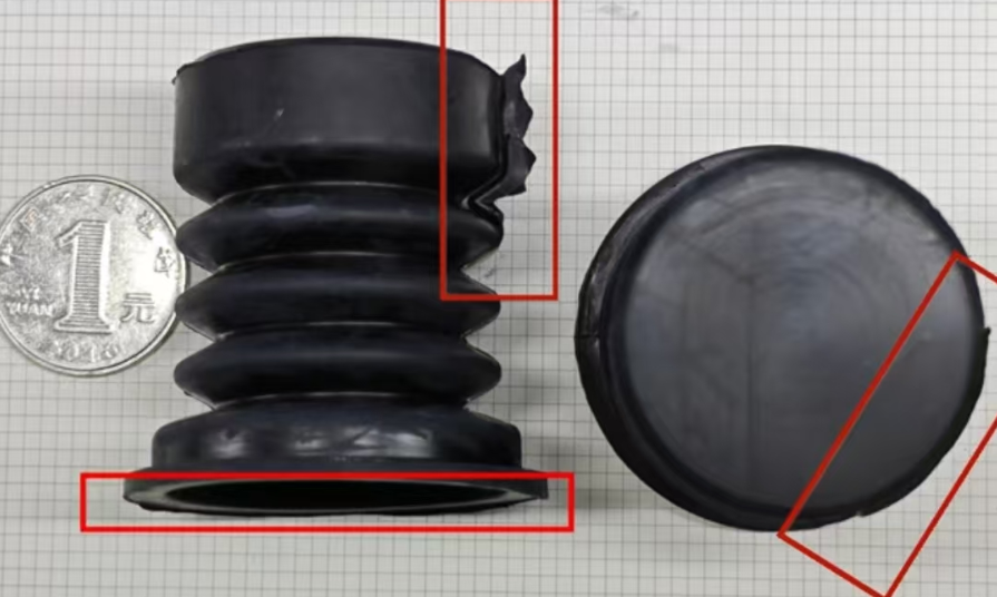 Today, the deflashing involves a rubber plug drain valve made of EPDM material. The product has relatively thick flash, mainly around the parting line. During product testing, the NS-120T model was chosen, which is suitable for deflashing most rubber products. The image below shows a comparison of the product before deflashing with a coin, with the flash highlighted in the red box.